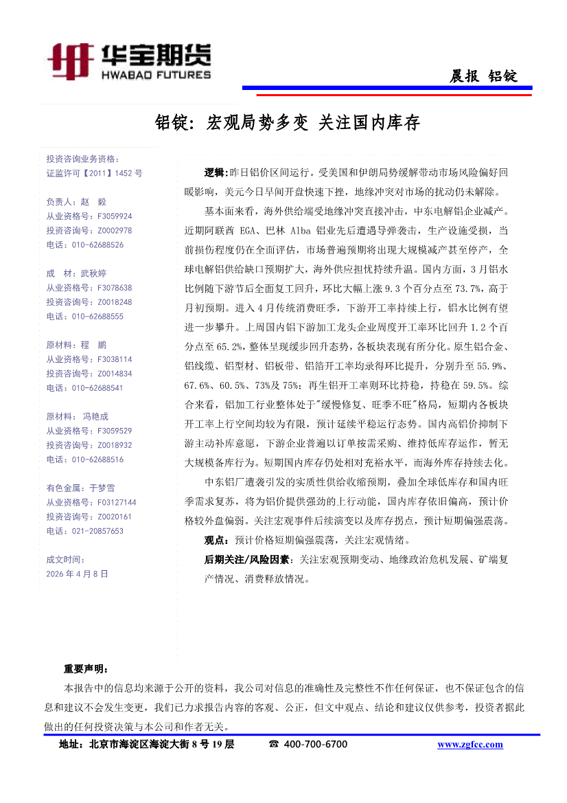 华宝期货-铝锭晨报:宏观局势多变,关注国内库存-260408