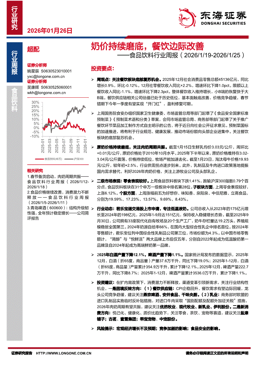 食品饮料行业:东海证券-食品饮料行业周报:奶价持续磨底,餐饮边际改善-260126