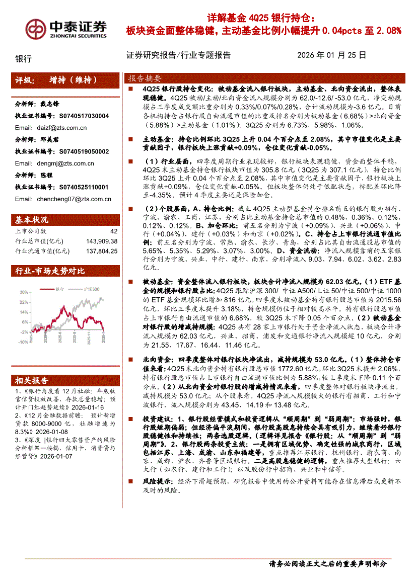 银行业:中泰证券-银行业详解基金4Q25银行持仓:板块资金面整体稳健,主动基金比例小幅提升0.04pcts至2.08%-260125