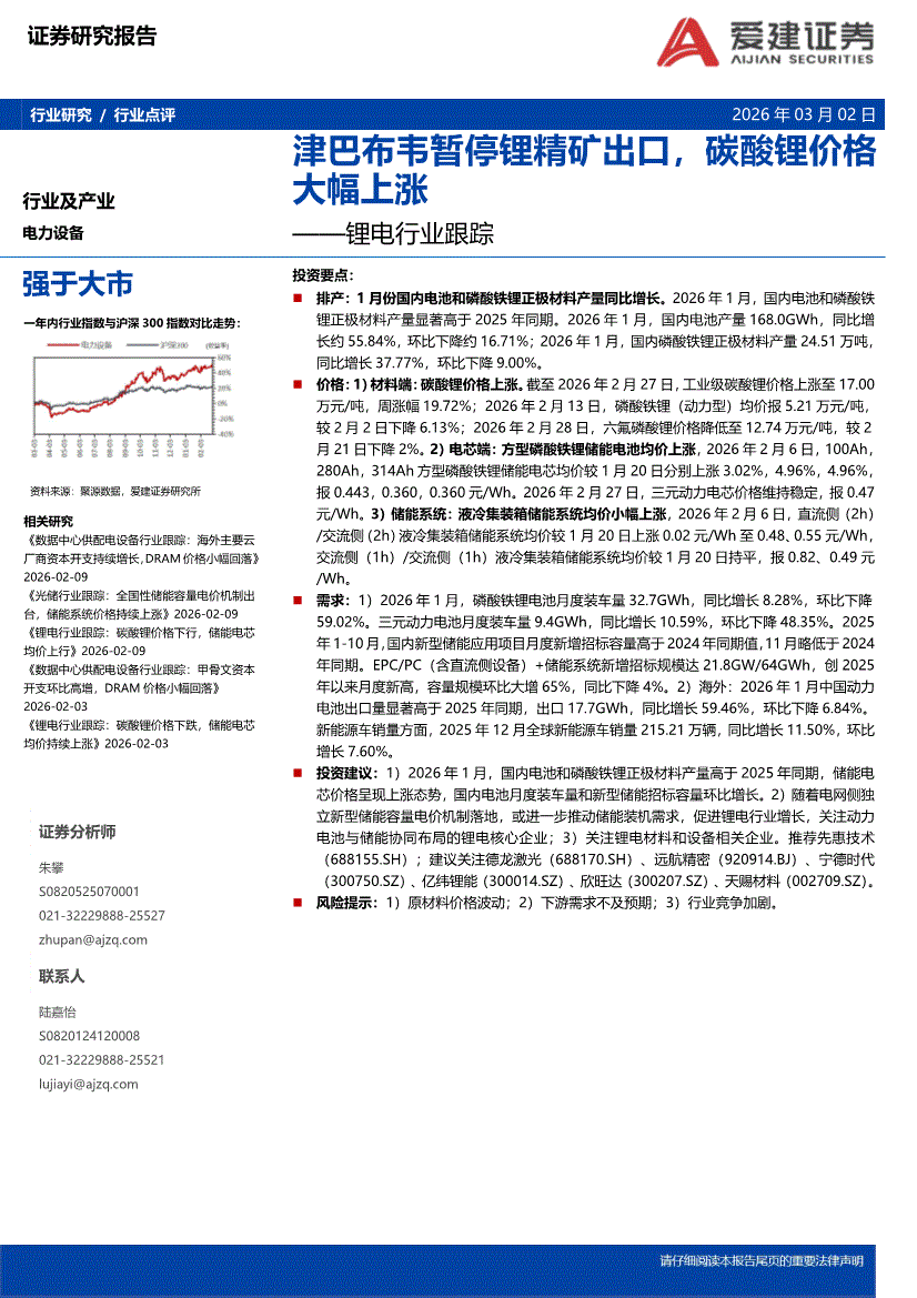 锂电行业:爱建证券-锂电行业跟踪:津巴布韦暂停锂精矿出口,碳酸锂价格大幅上涨-260302