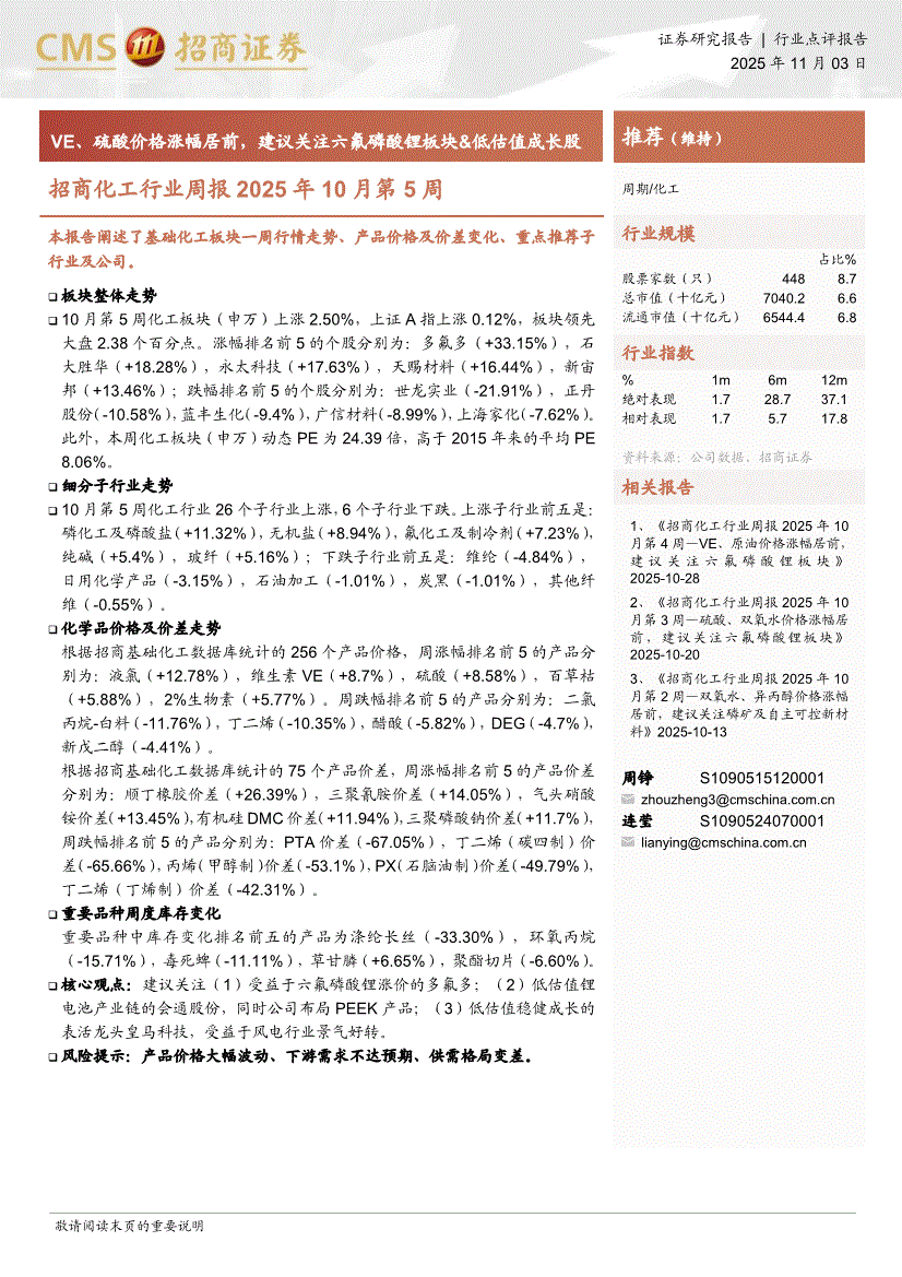 化工行业:招商证券-化工行业周报2025年10月第5周:VE、硫酸价格涨幅居前,建议关注六氟磷酸锂板块&低估值成长股-251103