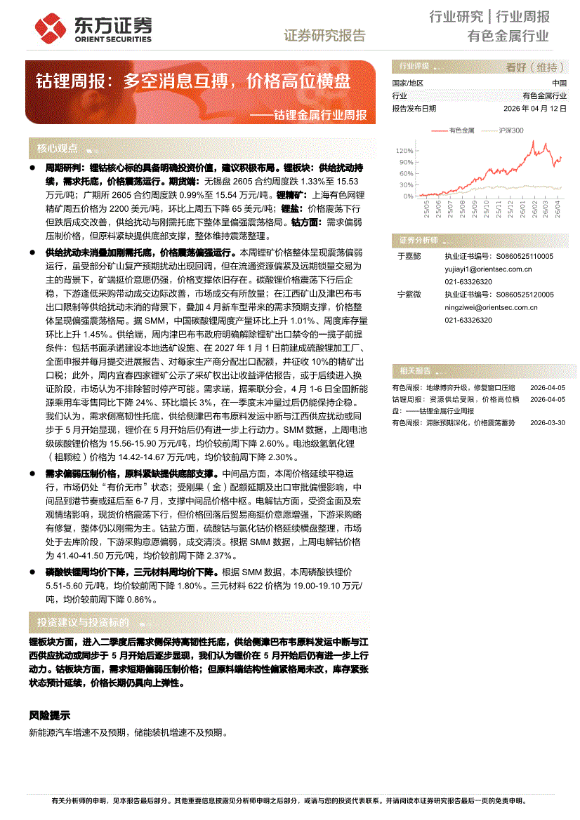 钴锂金属行业:东方证券-钴锂金属行业周报:多空消息互搏,价格高位横盘-260412