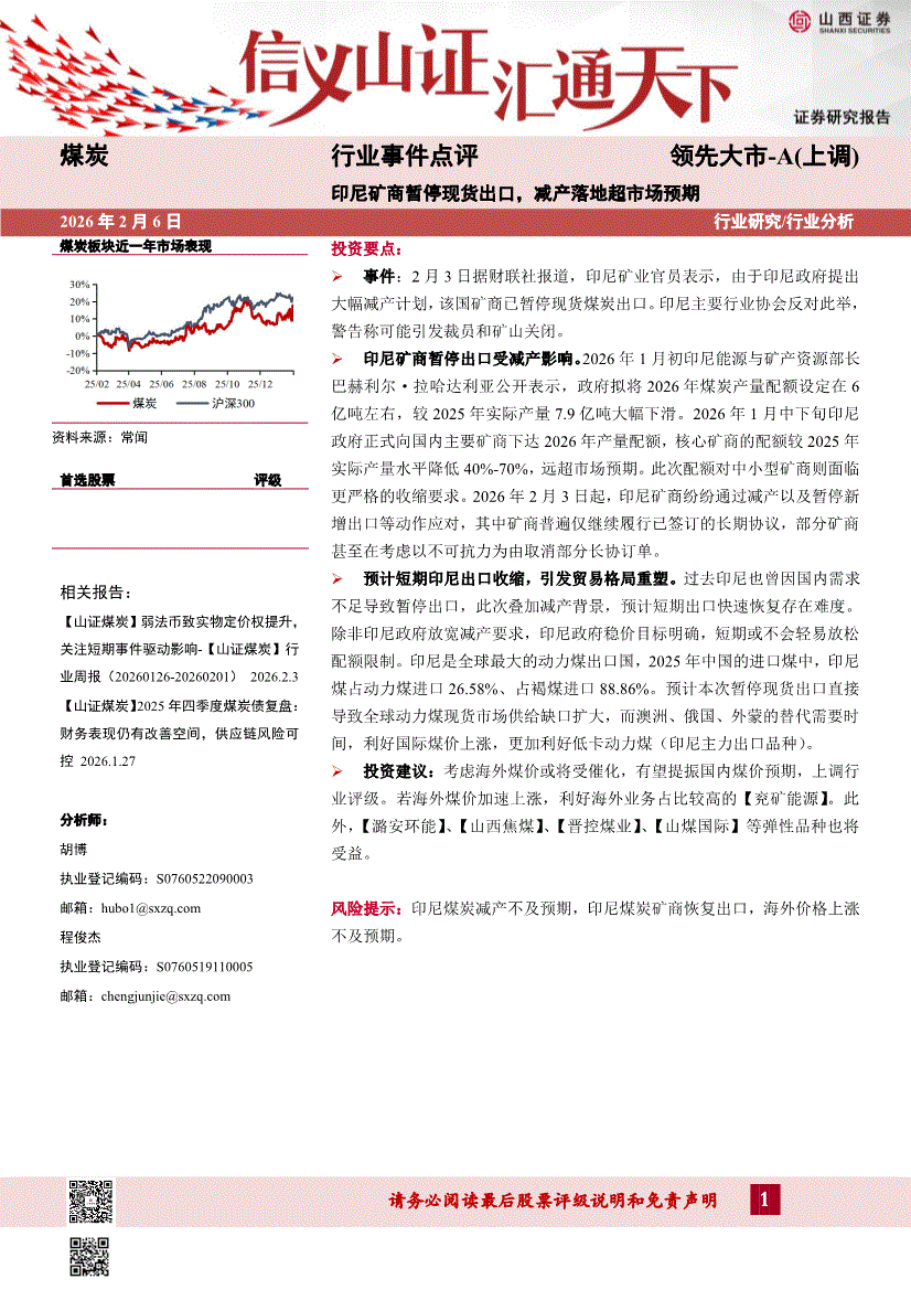 煤炭行业:山西证券-煤炭行业事件点评:印尼矿商暂停现货出口,减产落地超市场预期-260206