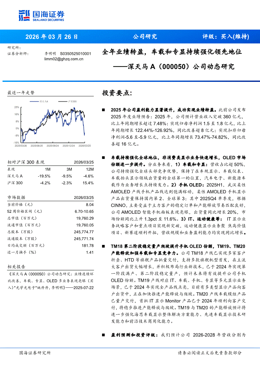 深天马A:国海证券-深天马A-000050-公司动态研究:全年业绩转盈,车载和专显持续强化领先地位-260326