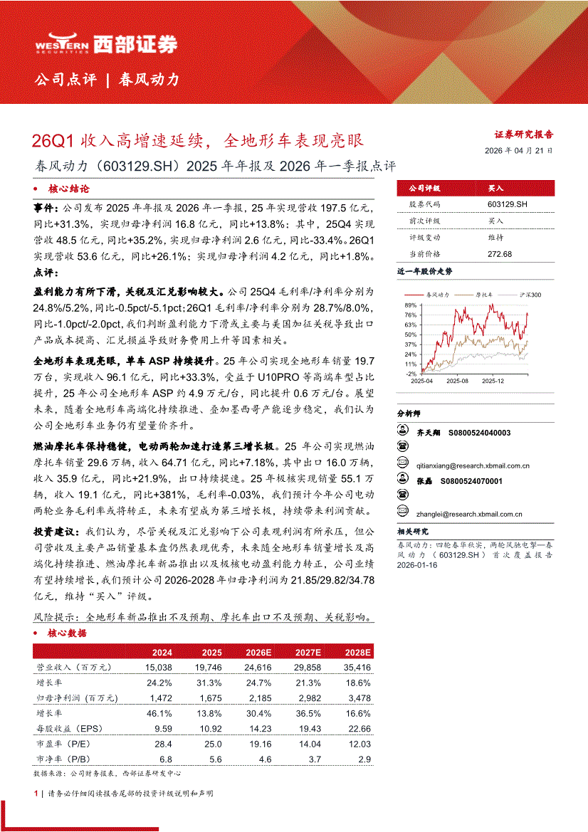 春风动力:西部证券-春风动力-603129-2025年年报及2026年一季报点评:26Q1收入高增速延续,全地形车表现亮眼-260421
