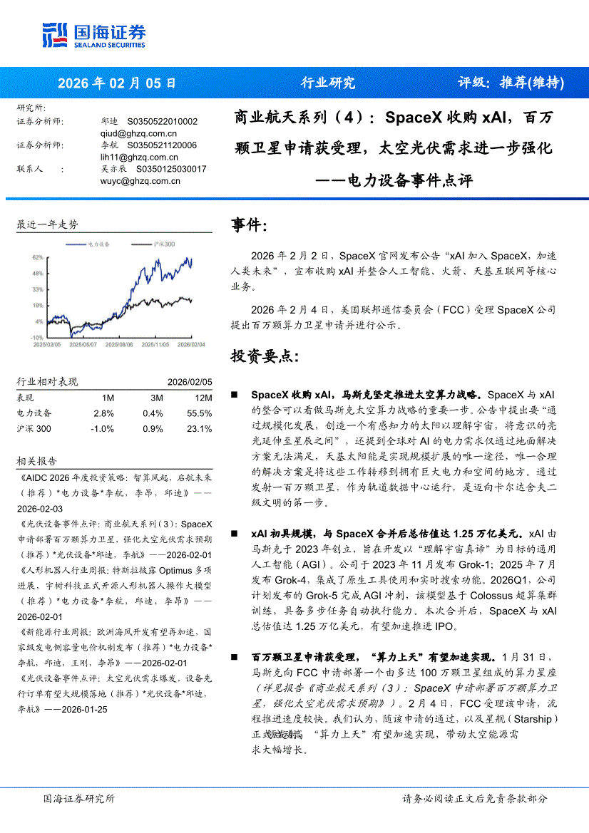 电力设备行业:国海证券-电力设备行业事件点评:商业航天系列(4),SpaceX收购xAI,百万颗卫星申请获受理,太空光伏需求进一步强化-260205