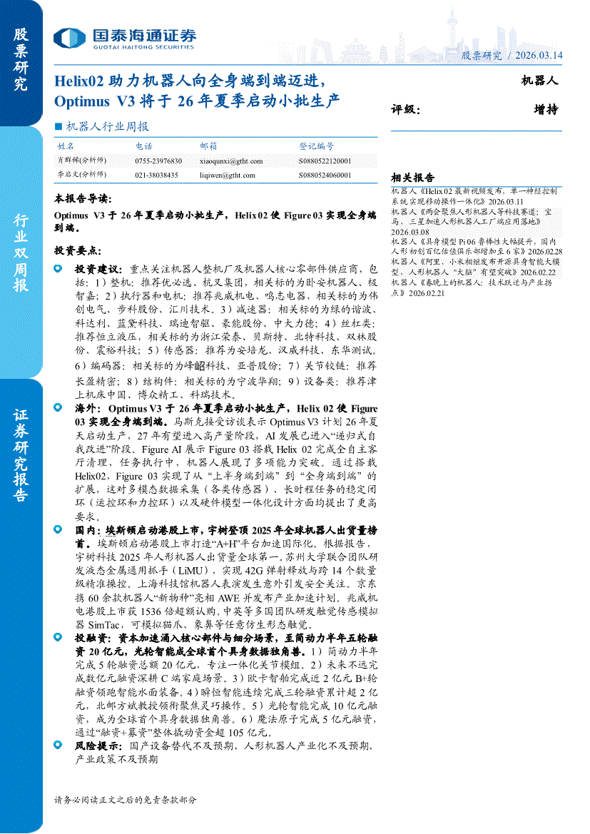 机器人行业:国泰海通证券-机器人行业周报:Helix02助力机器人向全身端到端迈进,Optimus V3将于26年夏季启动小批生产-260314