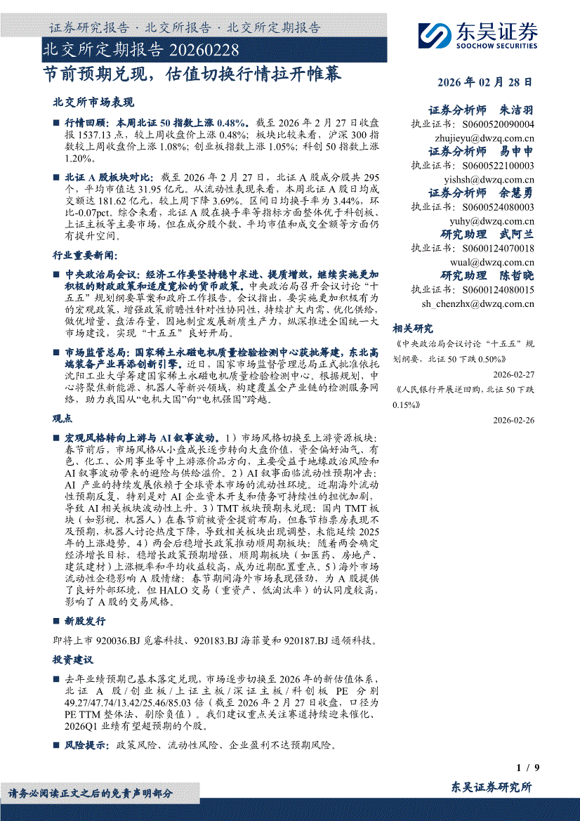 东吴证券-北交所定期报告:节前预期兑现,估值切换行情拉开帷幕-260228
