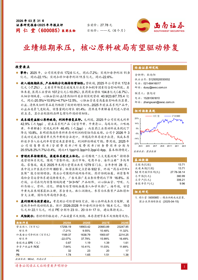 同仁堂:西南证券-同仁堂-600085-业绩短期承压,核心原料破局有望驱动修复-260331