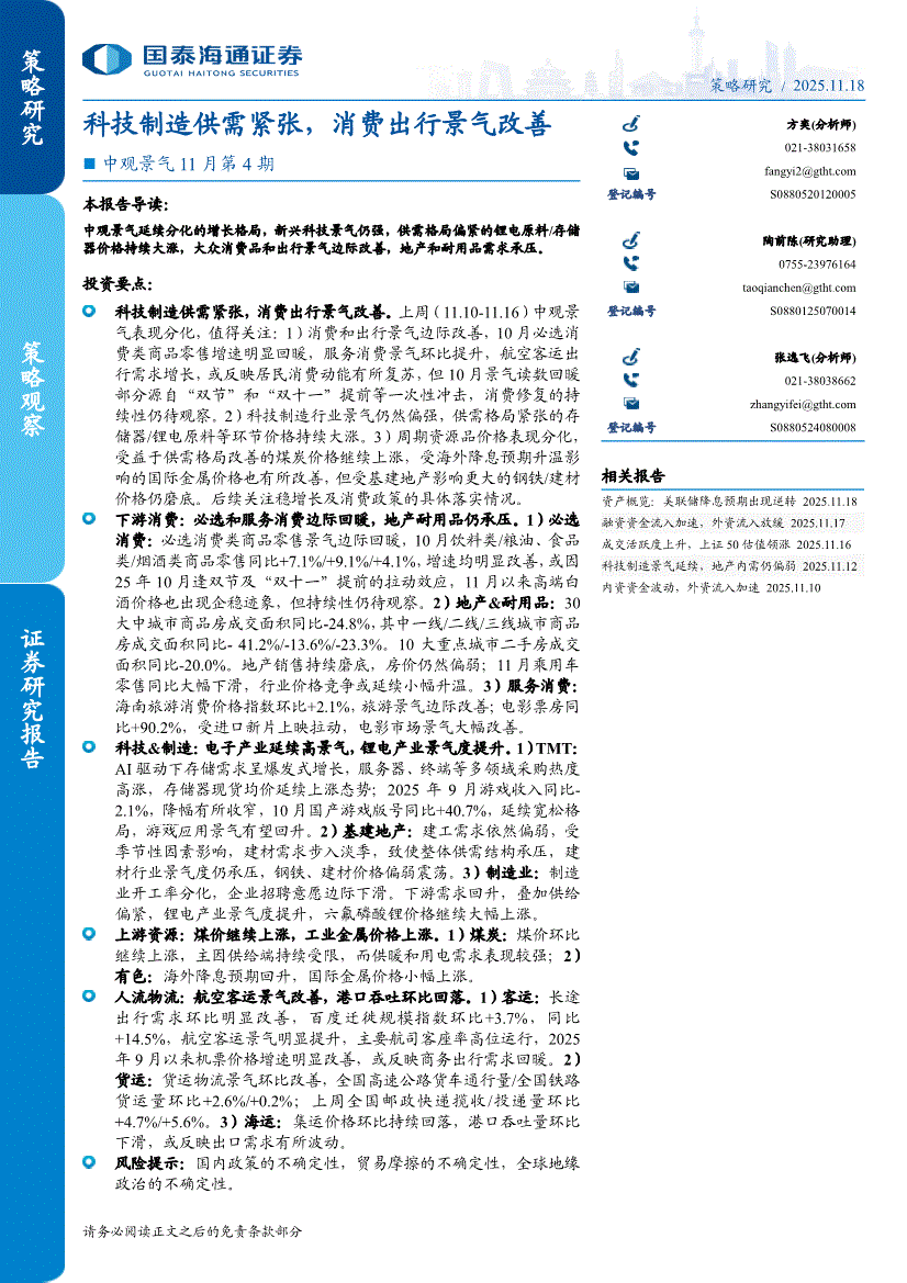 国泰海通证券-中观景气11月第4期:科技制造供需紧张,消费出行景气改善-251118