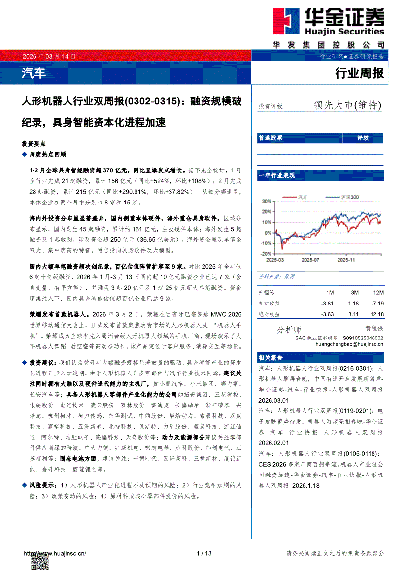 人形机器人行业:华金证券-人形机器人行业双周报(0302~0315):融资规模破纪录,具身智能资本化进程加速-260314