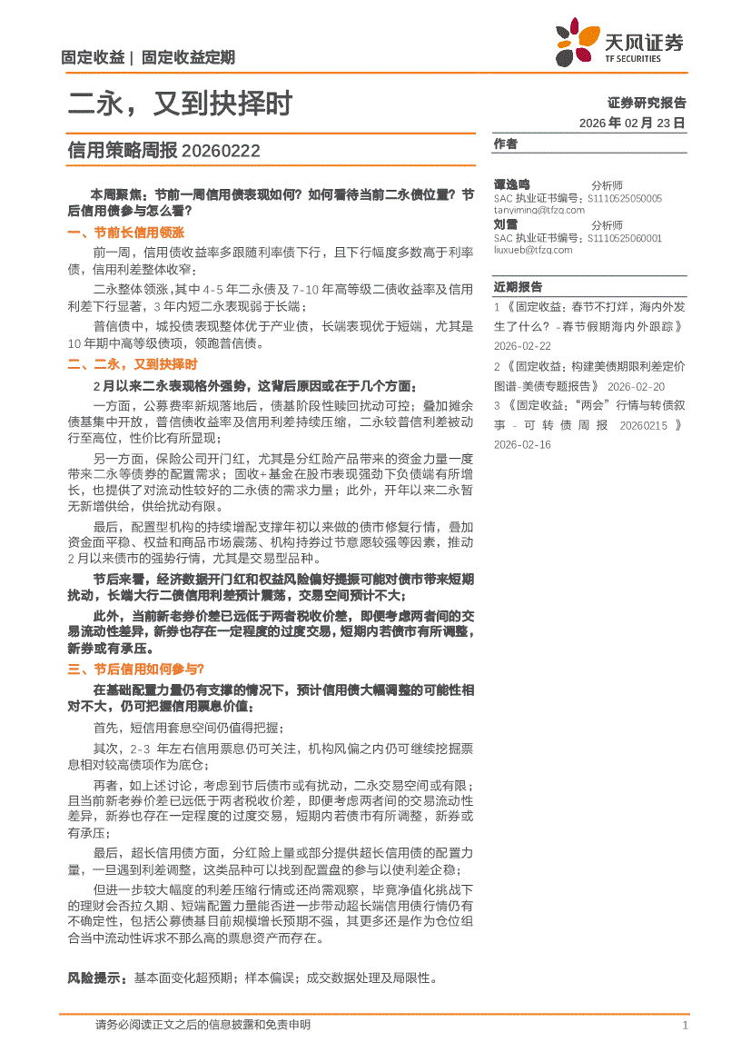天风证券-信用策略周报:二永,又到抉择时-260223