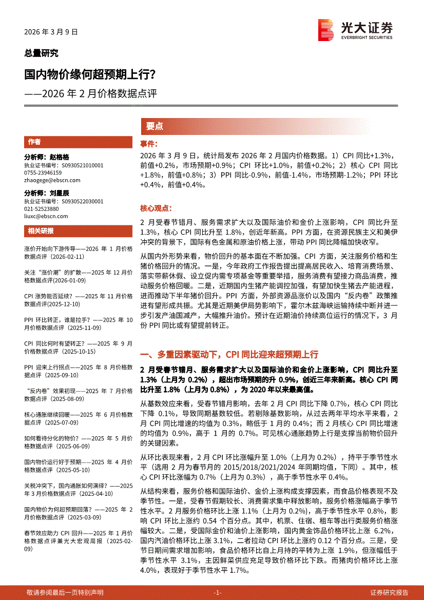 光大证券-2026年2月价格数据点评:国内物价缘何超预期上行?-260309