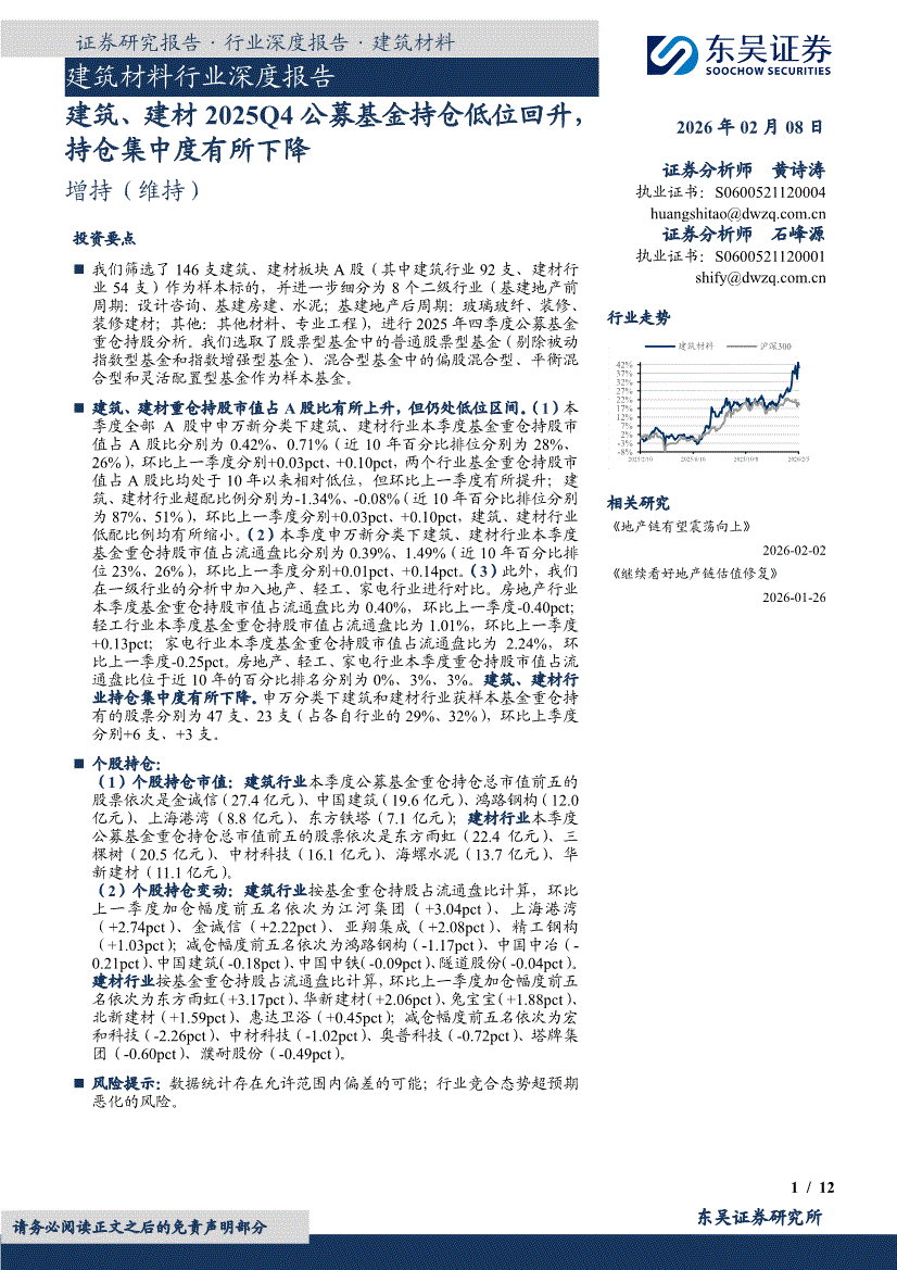 建筑材料行业:东吴证券-建筑材料行业深度报告:建筑、建材2025Q4公募基金持仓低位回升,持仓集中度有所下降-260208