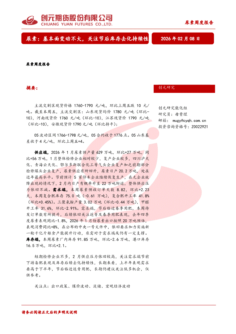 创元期货-尿素周度报告:基本面变动不大,关注节后库存去化持续性-260208