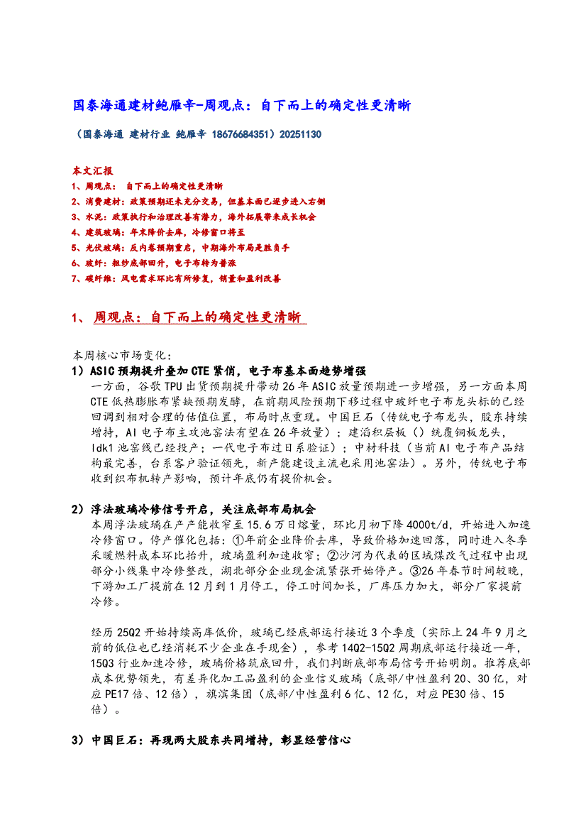 建材行业:国泰海通证券-建材行业周观点:自下而上的确定性更清晰-251130