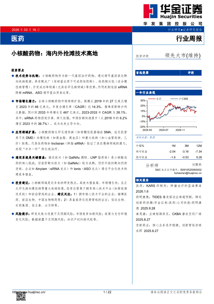 医药行业:华金证券-医药行业周报:小核酸药物,海内外抢滩技术高地-260316
