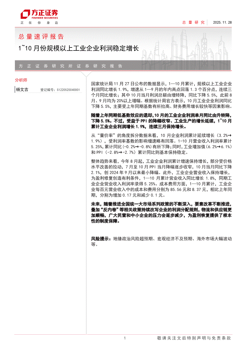 方正证券-总量速评报告:1~10月份规模以上工业企业利润稳定增长-251128