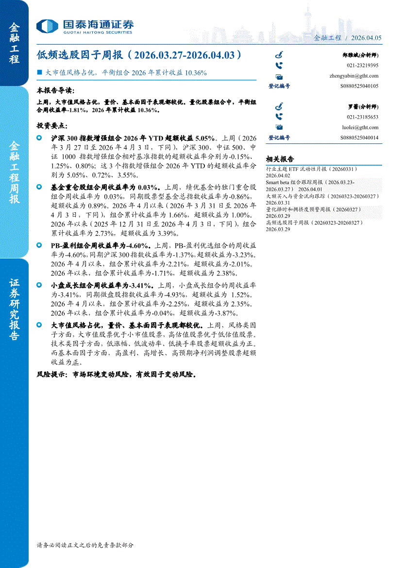 国泰海通证券-低频选股因子周报:大市值风格占优,平衡组合2026年累计收益10.36%-260405