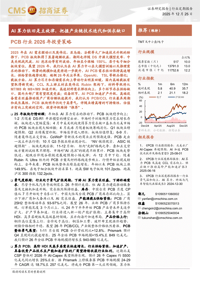 PCB行业:招商证券-PCB行业2026年投资策略:AI算力依旧是主旋律,把握产业链技术迭代和供求缺口-251225