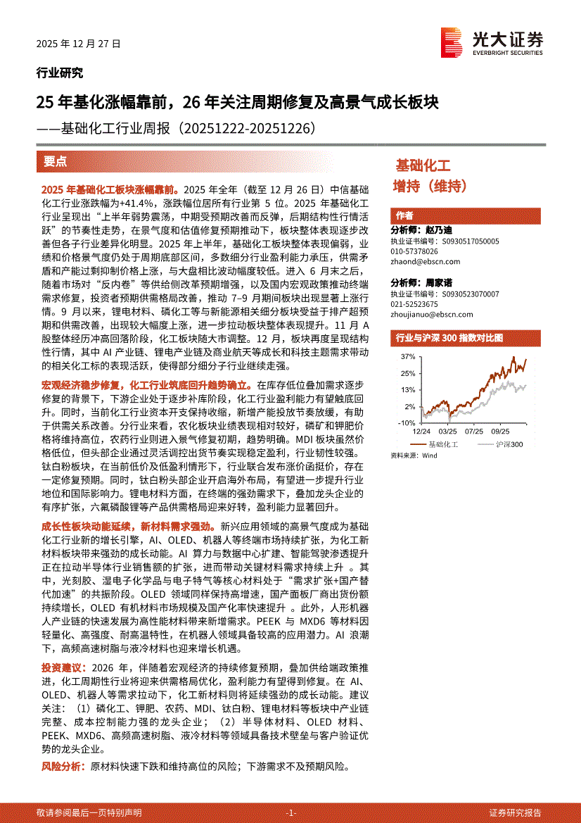 基础化工行业:光大证券-基础化工行业周报:25年基化涨幅靠前,26年关注周期修复及高景气成长板块-251227