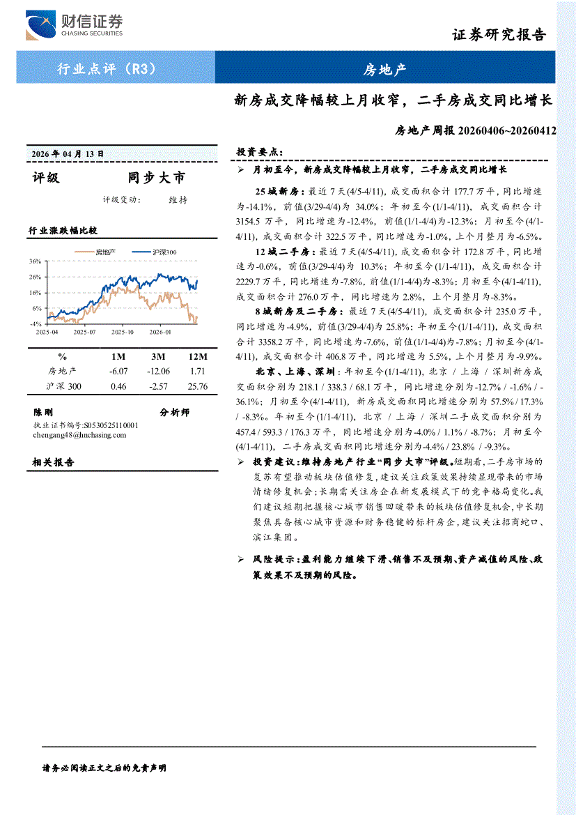 房地产行业:财信证券-房地产行业周报:新房成交降幅较上月收窄,二手房成交同比增长-260413