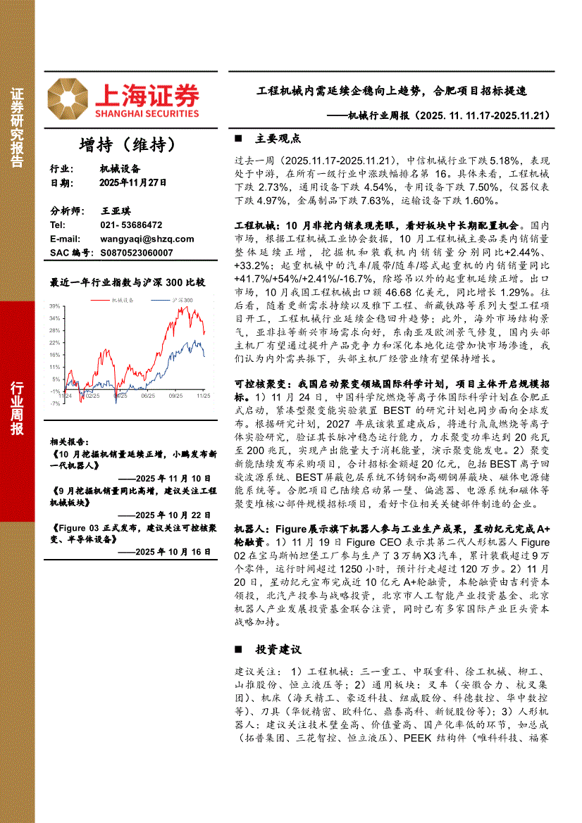 机械行业:上海证券-机械设备行业周报:工程机械内需延续企稳向上趋势,合肥项目招标提速-251127
