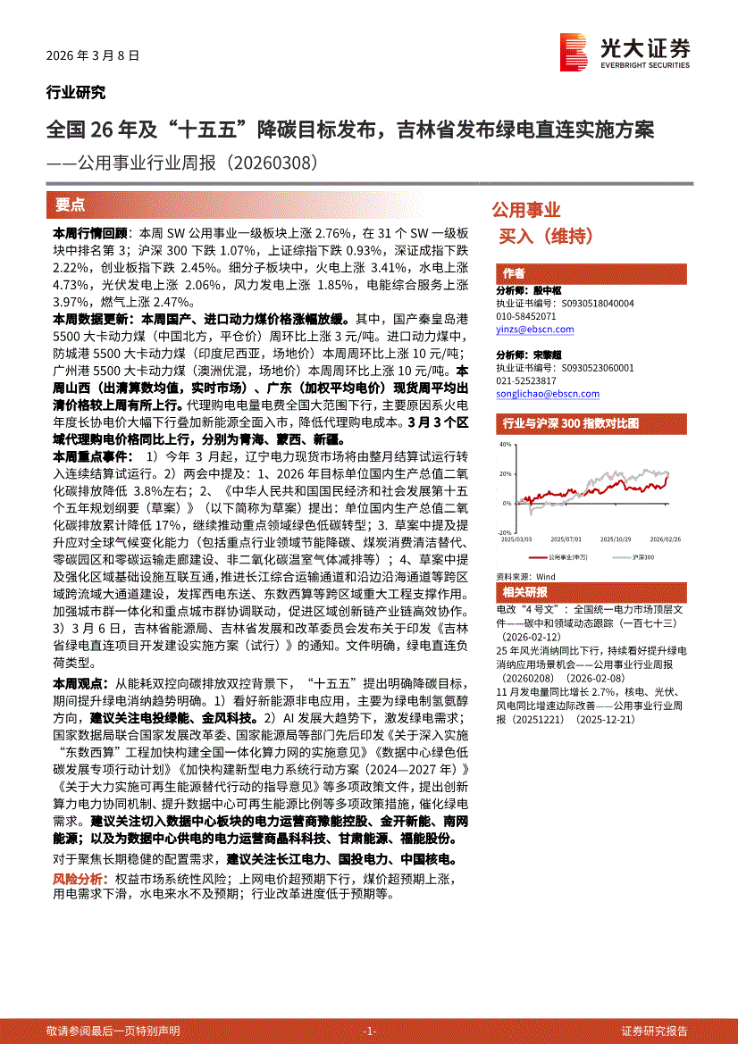 公用事业行业:光大证券-公用事业行业周报:全国26年及“十五五”降碳目标发布,吉林省发布绿电直连实施方案-260308