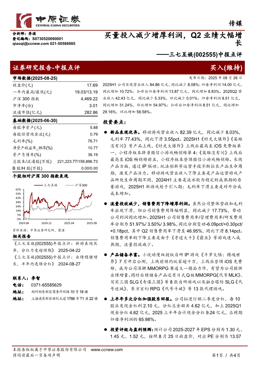 三七互娱:中原证券-三七互娱-002555-中报点评:买量投入减少增厚利润,Q2业绩大幅增长-250826