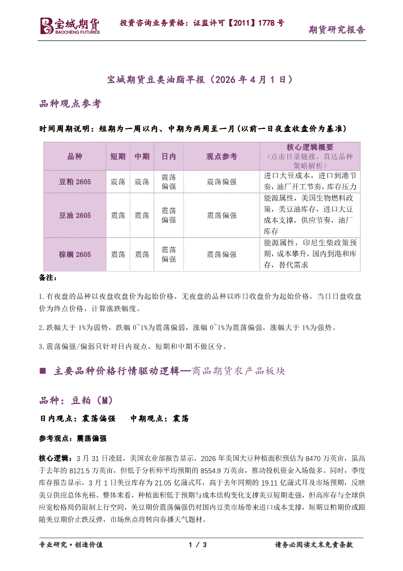 宝城期货-豆类油脂早报-260401