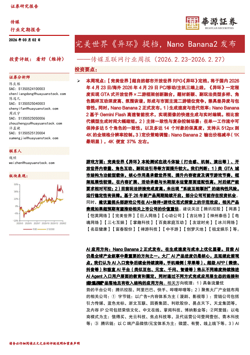 传媒互联网行业:华源证券-传媒互联网行业周报:完美世界《异环》提档,Nano Banana2发布-260302