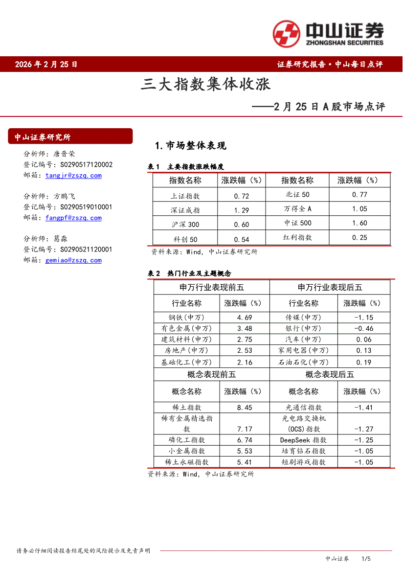 中山证券-2月25日A股市场点评:三大指数集体收涨-260225