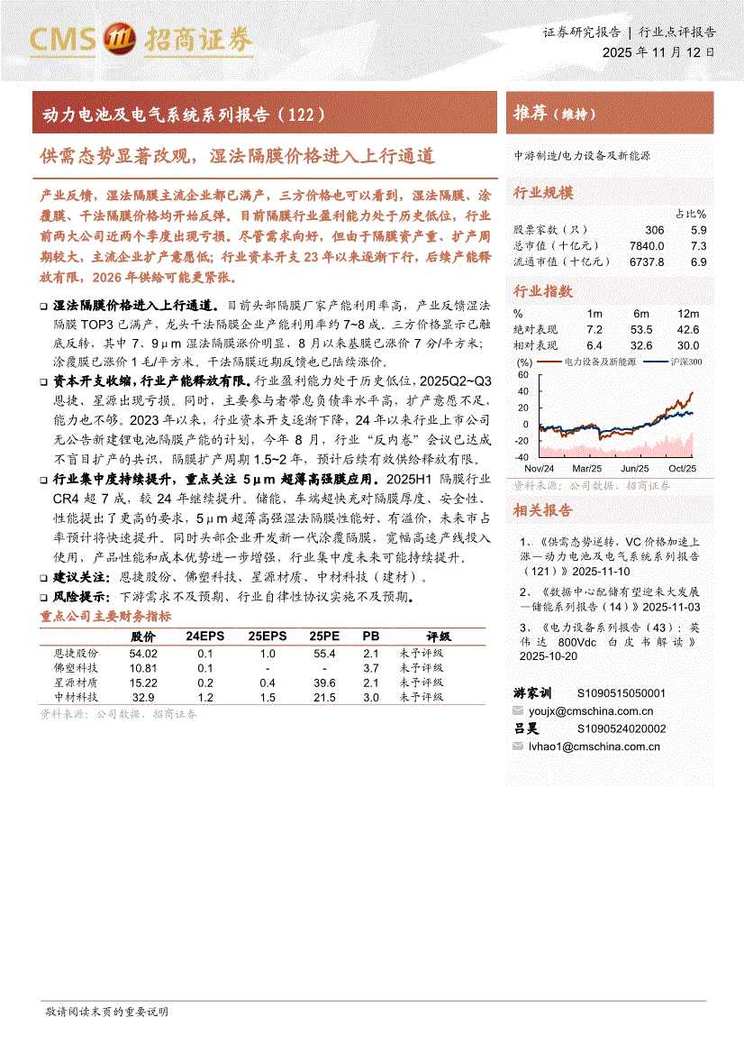 电力设备及新能源行业:招商证券-电力设备及新能源行业动力电池及电气系统系列报告(122):供需态势显著改观,湿法隔膜价格进入上行通道-251112