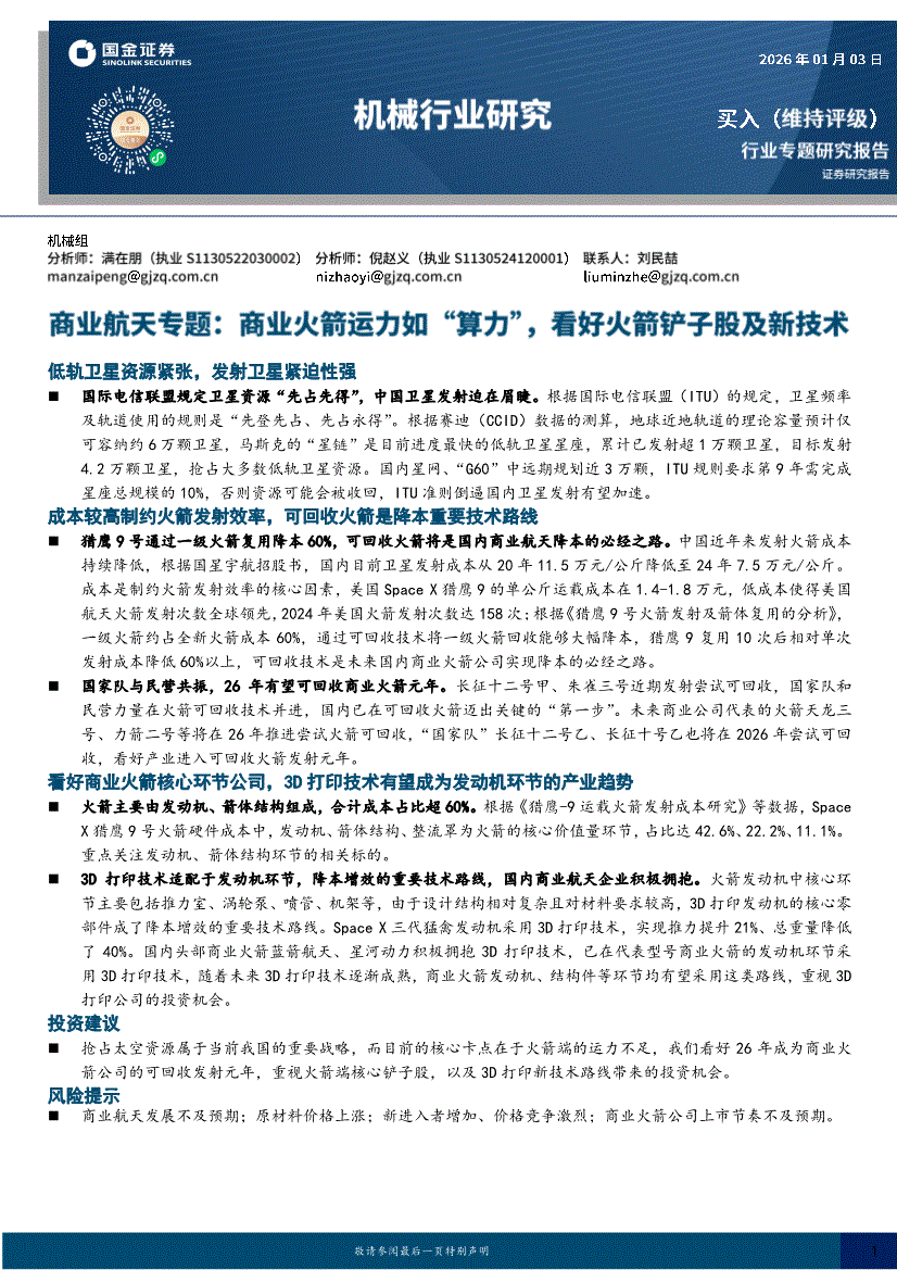 机械行业:国金证券-机械行业商业航天专题:商业火箭运力如“算力”,看好火箭铲子股及新技术-260103