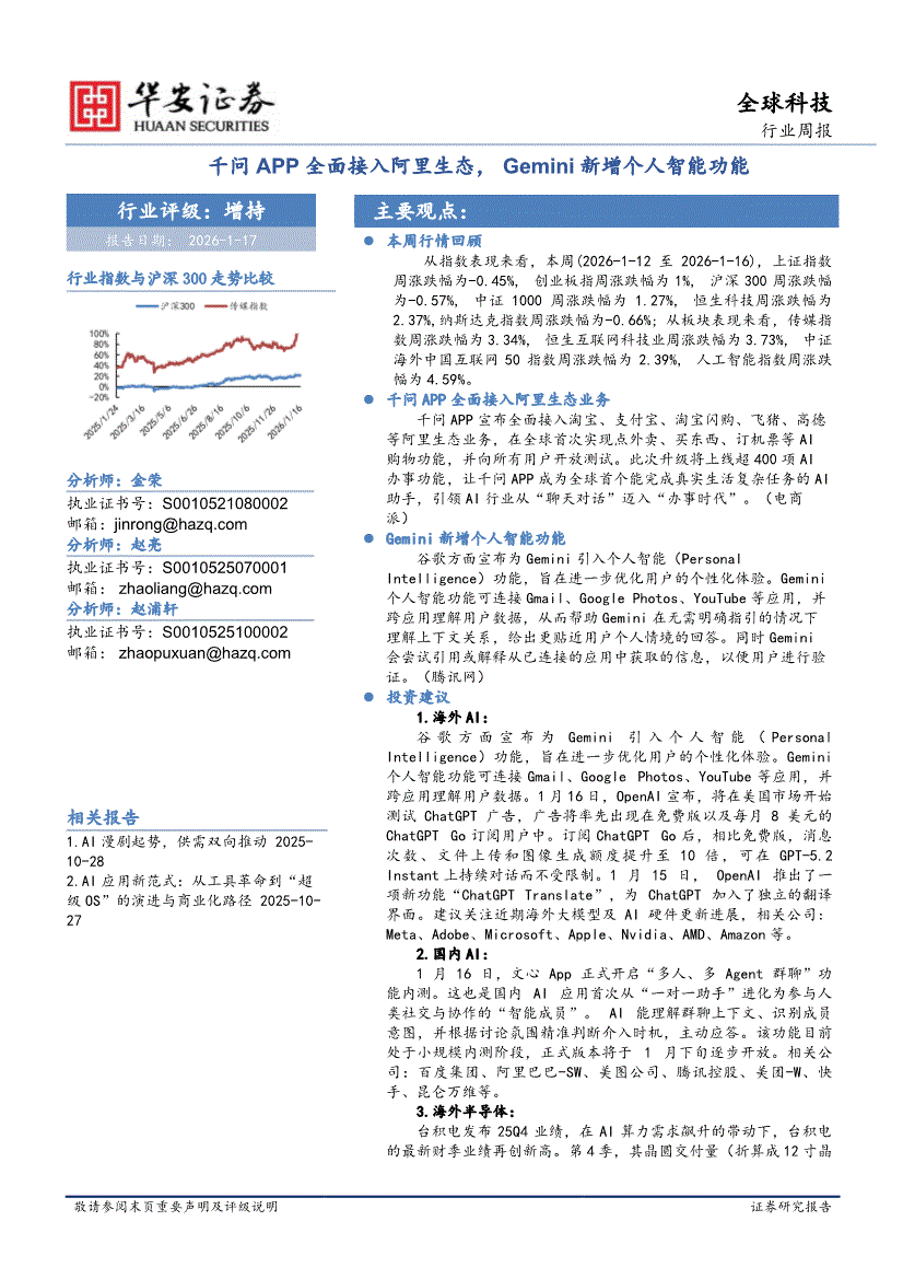科技行业:华安证券-全球科技行业周报:千问APP全面接入阿里生态,Gemini新增个人智能功能-260117