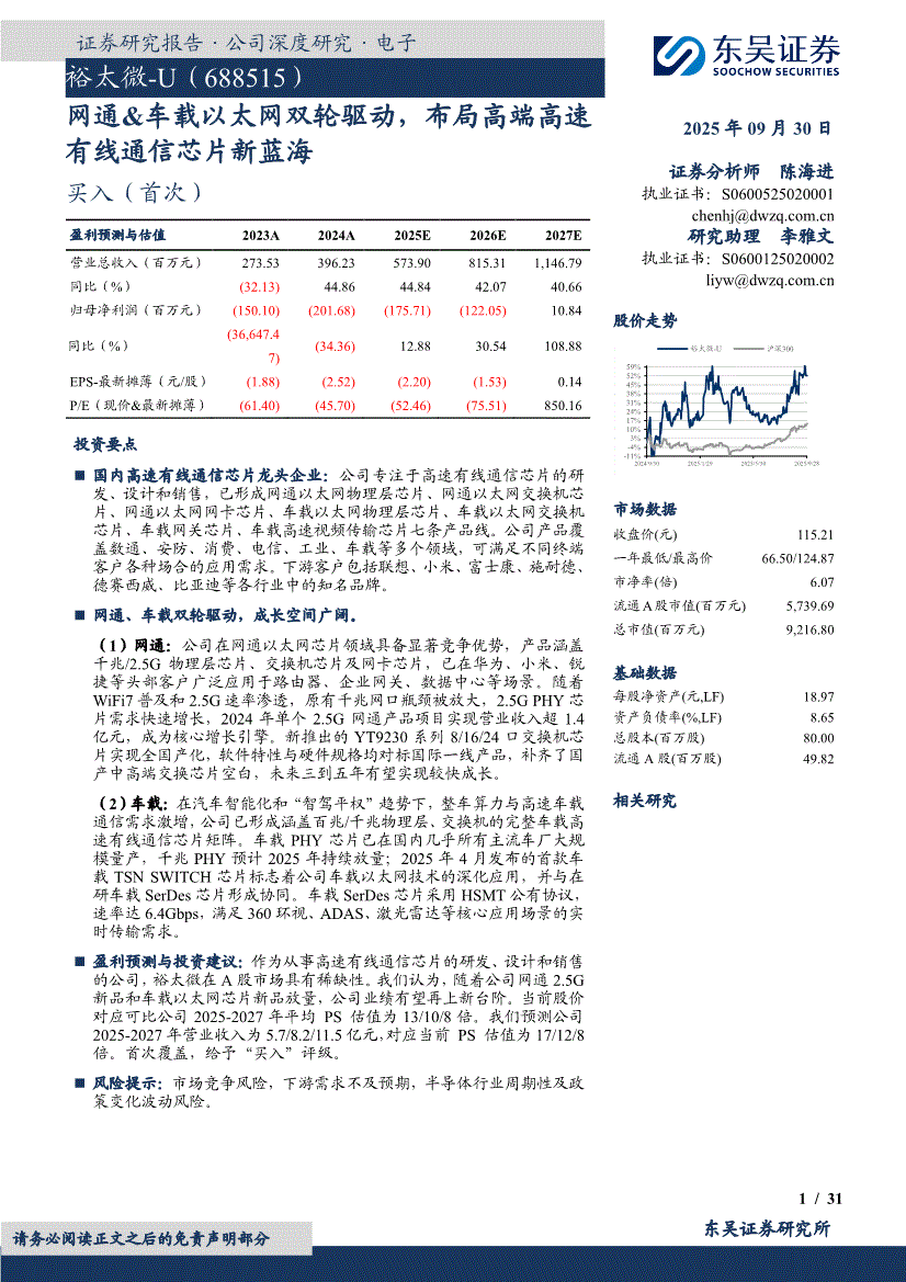 裕太微:东吴证券-裕太微-688515-网通&车载以太网双轮驱动,布局高端高速有线通信芯片新蓝海-250930