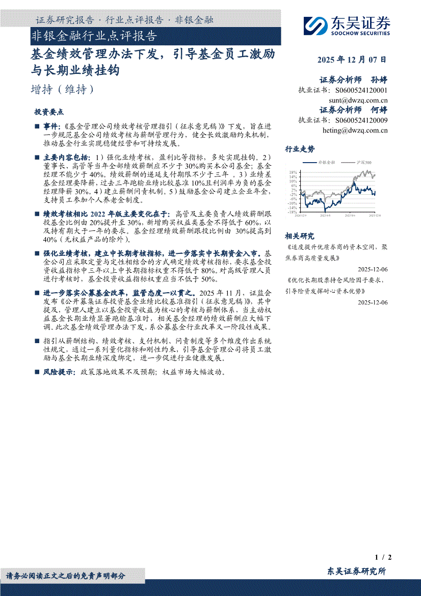 非银金融行业:东吴证券-非银金融行业点评报告:基金绩效管理办法下发,引导基金员工激励与长期业绩挂钩-251207