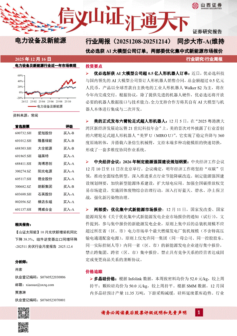 电力设备及新能源行业:山西证券-电力设备及新能源行业周报:优必选获AI大模型公司订单,两部委优化集中式新能源市场报价-251216
