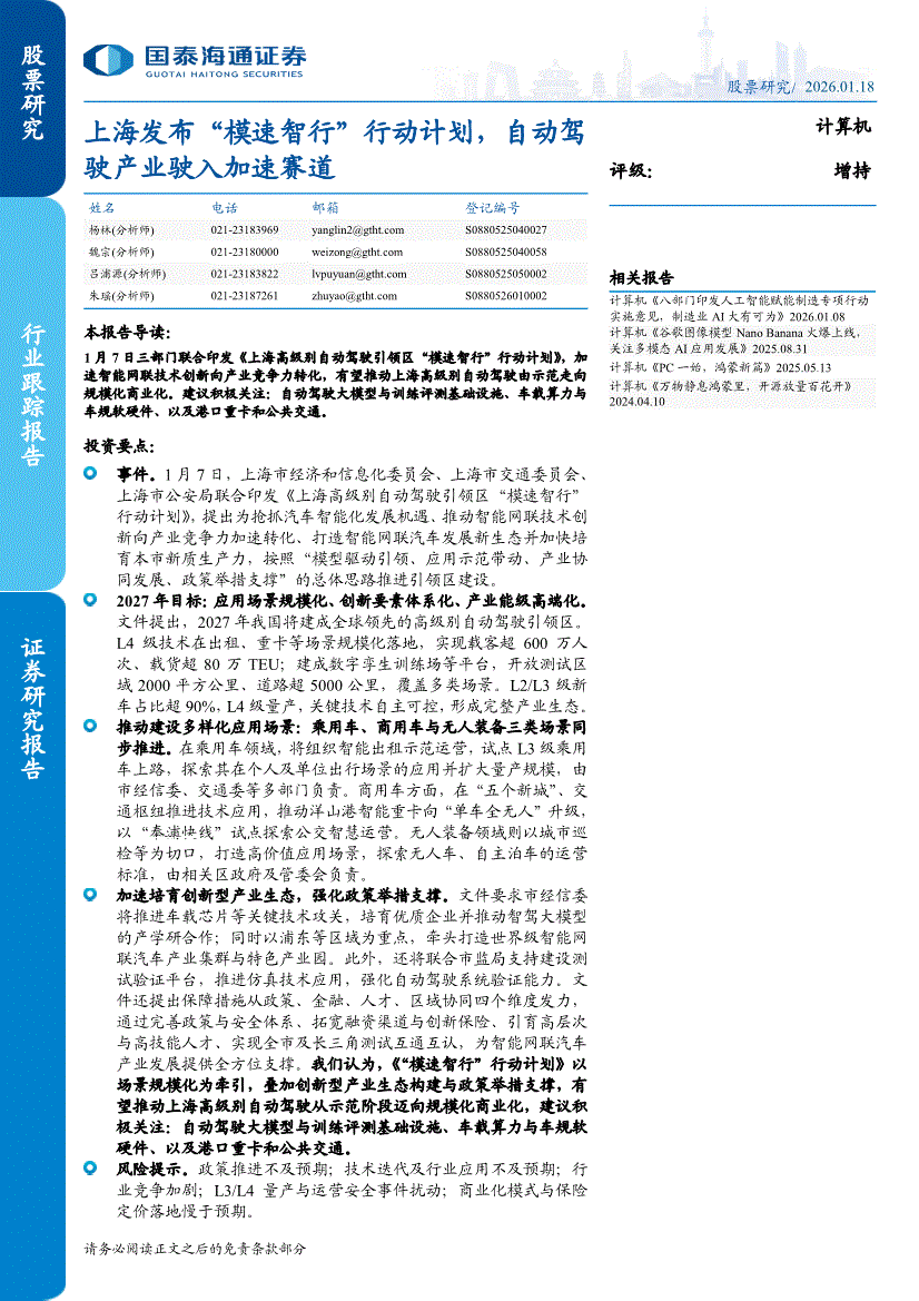 计算机行业:国泰海通证券-计算机行业:上海发布“模速智行”行动计划,自动驾驶产业驶入加速赛道-260118