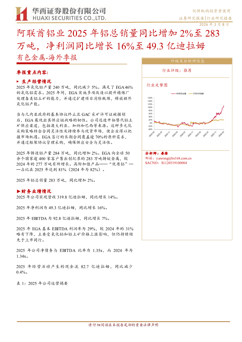 有色金属行业:华西证券-有色金属行业~海外季报:阿联酋铝业2025年铝总销量同比增加2%至283万吨,净利润同比增长16%至49.3亿迪拉姆-260308