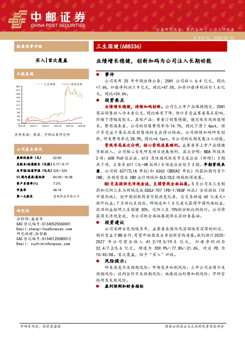 三生国健:中邮证券-三生国健-688336-业绩增长稳健,创新加码为公司注入长期动能-250902