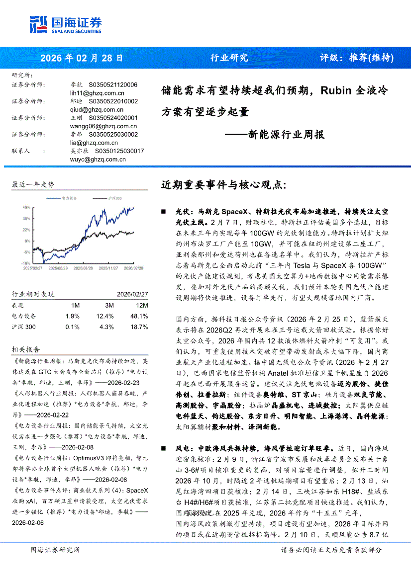 新能源行业:国海证券-新能源行业周报:储能需求有望持续超我们预期,Rubin全液冷方案有望逐步起量-260228