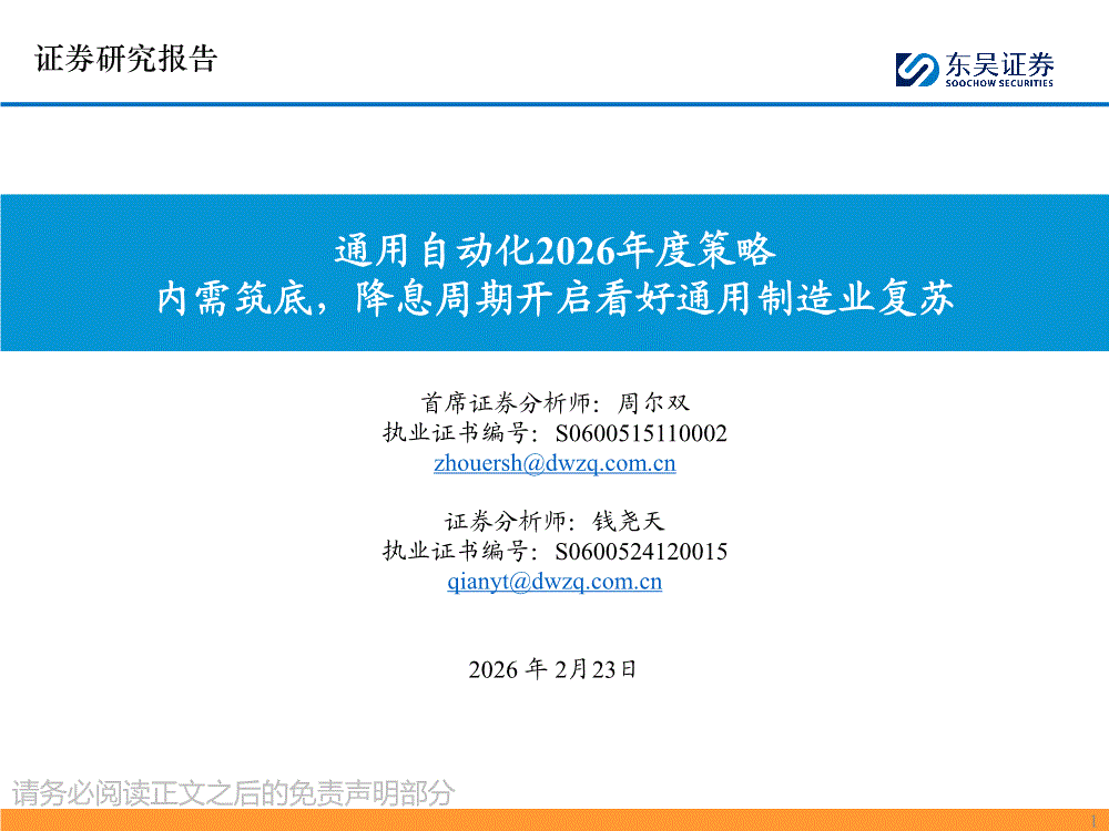 通用自动化行业:东吴证券-通用自动化行业2026年度策略:内需筑底,降息周期开启看好通用制造业复苏-260223