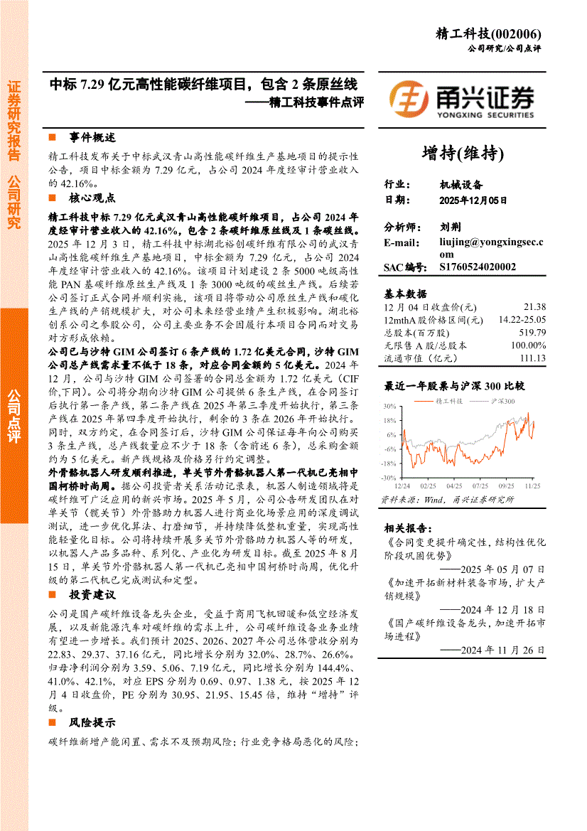 精工科技:甬兴证券-精工科技-002006-事件点评:中标7.29亿元高性能碳纤维项目,包含2条原丝线-251205