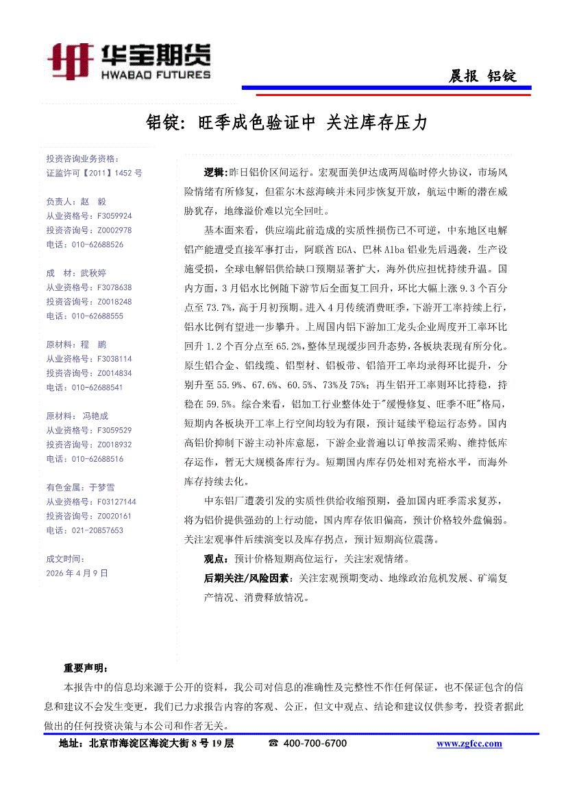华宝期货-铝锭晨报:旺季成色验证中,关注库存压力-260409