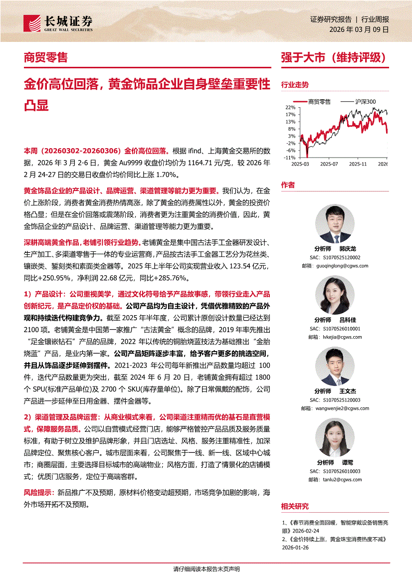 商贸零售行业:长城证券-商贸零售行业周报:金价高位回落,黄金饰品企业自身壁垒重要性凸显-260309