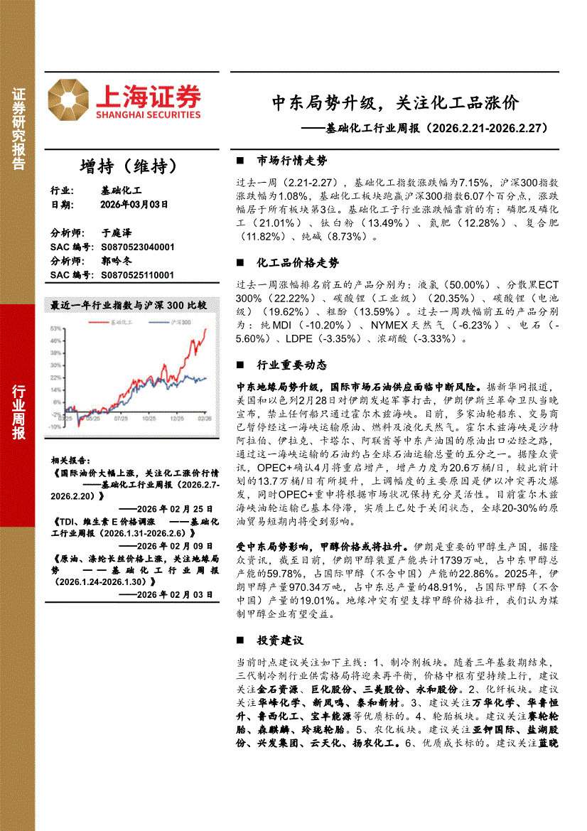 基础化工行业:上海证券-基础化工行业周报:中东局势升级,关注化工品涨价-260303