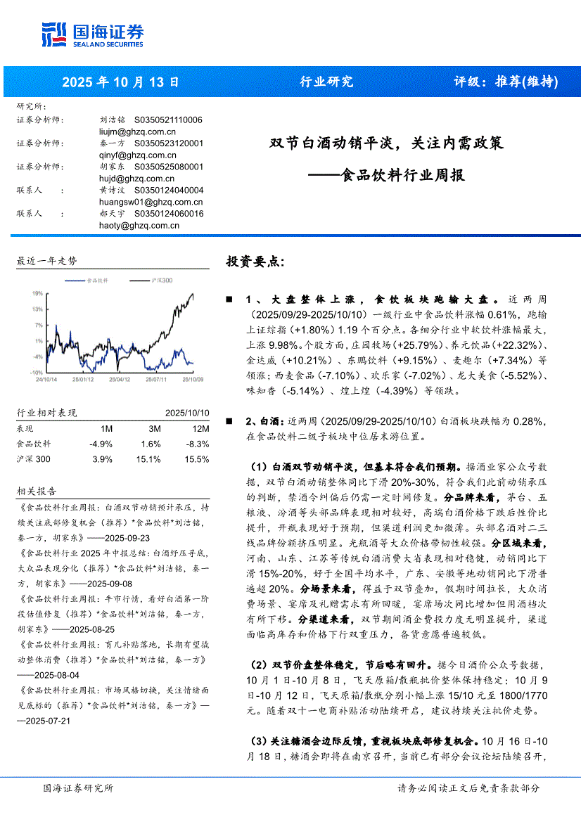 食品饮料行业:国海证券-食品饮料行业周报:双节白酒动销平淡,关注内需政策-251013