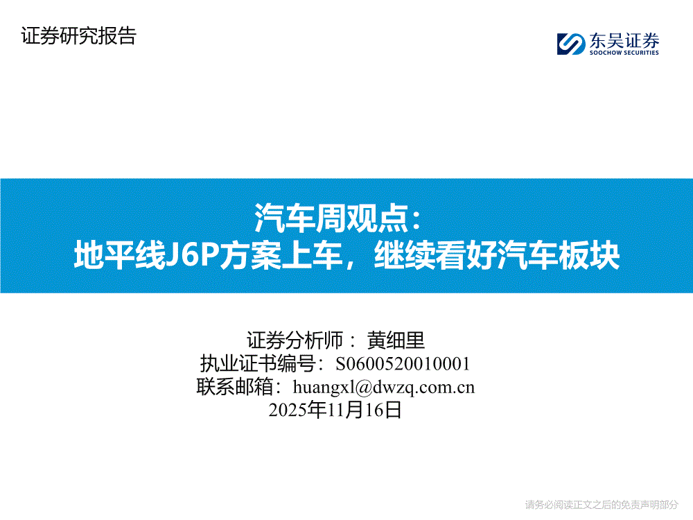 汽车行业:东吴证券-汽车行业周观点:地平线J6P方案上车,继续看好汽车板块-251116