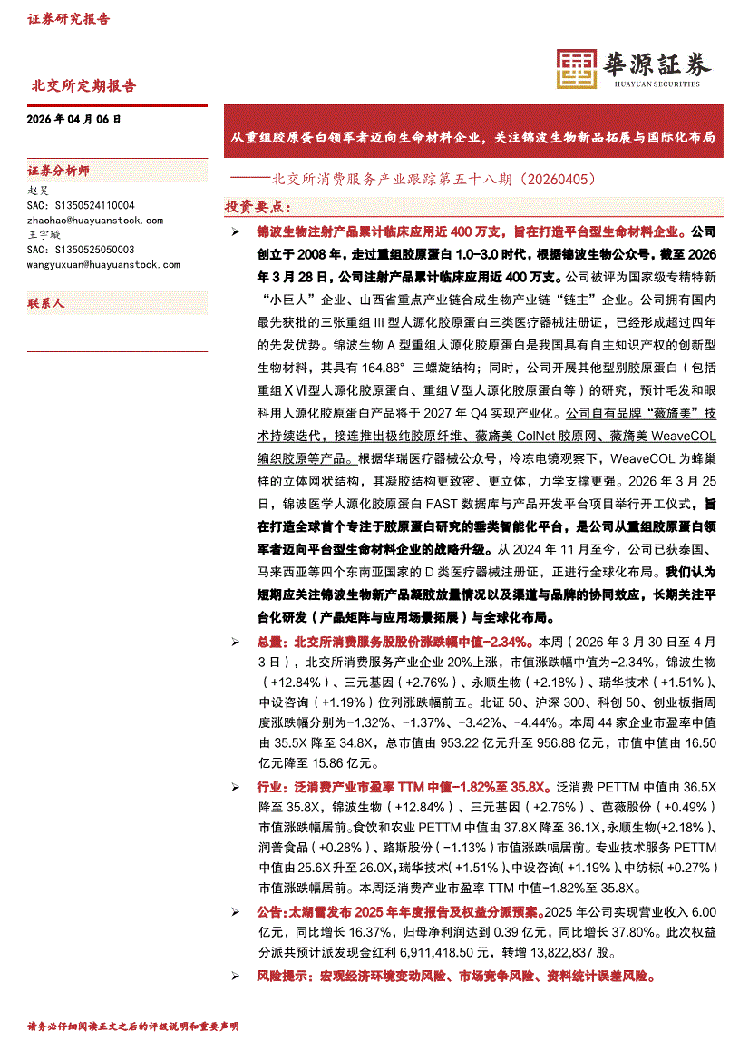 华源证券-北交所消费服务产业跟踪第五十八期:从重组胶原蛋白领军者迈向生命材料企业,关注锦波生物新品拓展与国际化布局-260406